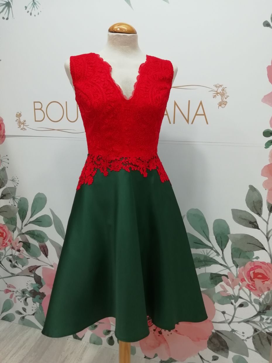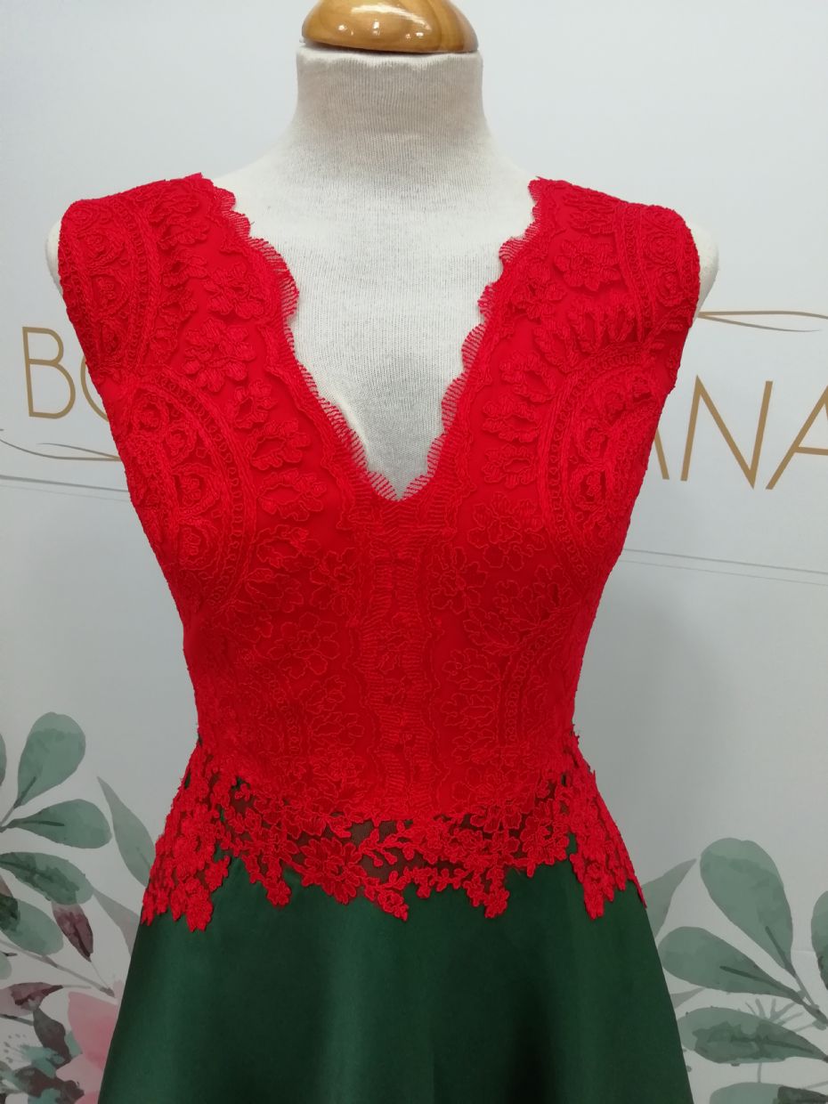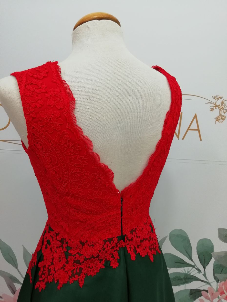 Vestido Ref. AMOR, combina el cuerpo de encaje con onda en el escote de pico y falda de capa.
